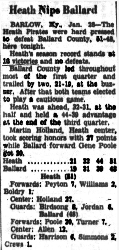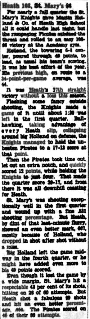 The Heath High School boys scored at will last night to decisively trounce the Sharpe boys 35 to 11. In the first half the Heath boys were completely outplayed; but the last two quarters the Pirates came back to pile up the deciding points. Bagwell, Miller, and Craig proved a valuable combination to the winning […]