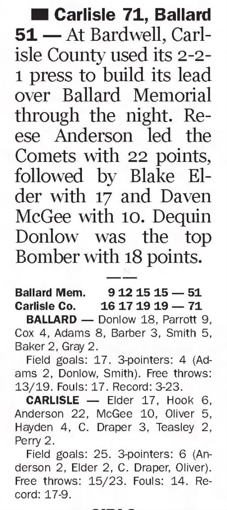 Carlisle Defeats Ballard Behind Reese Anderson with 22, Blake Elder with 17, And Daven McGee with 10. – 2020